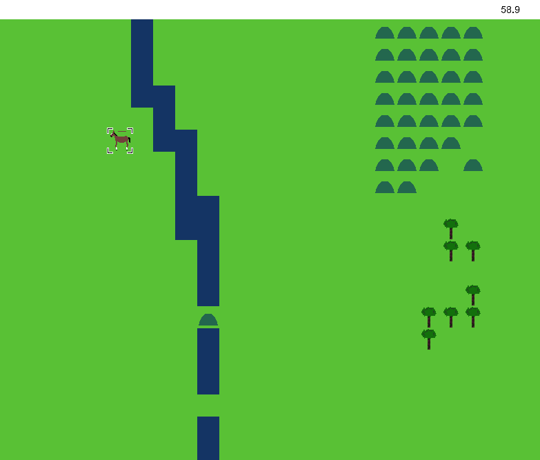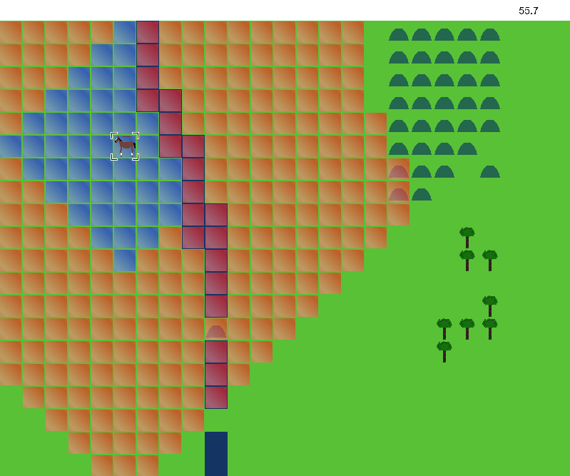 Some simple tiles have been implemented, with appropriate movement costs for a magical combat horse: she gets slowed down significantly on hills. She should only be able to walk 5 tiles, but I have not yet implemented the movement limit. Godmode Magical Combat Horse.